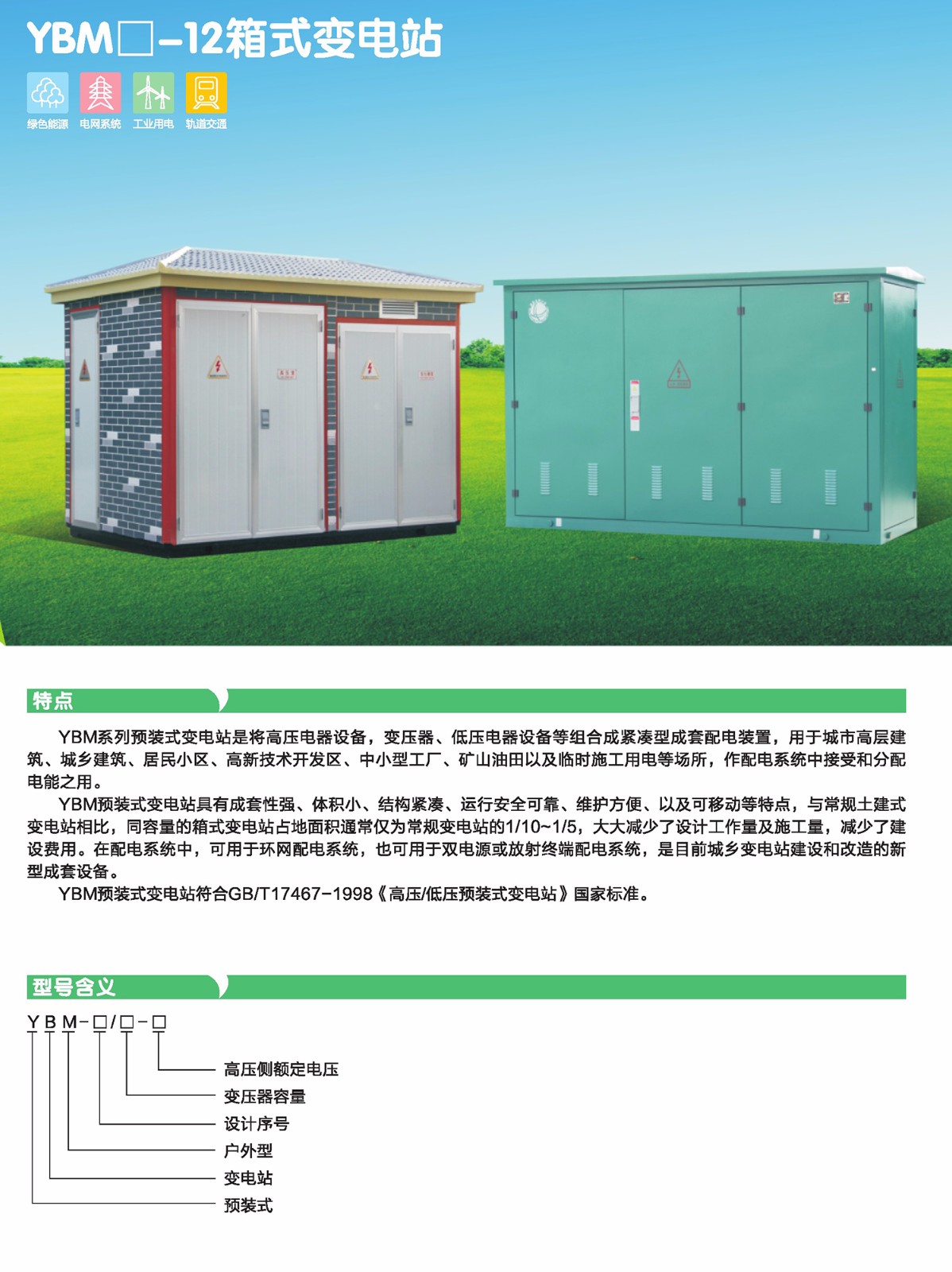 YBM預(yù)裝式變電站符合GB/T17467-1998《高月E/低壓預(yù)裝式變電站》國(guó)家標(biāo)準(zhǔn)。