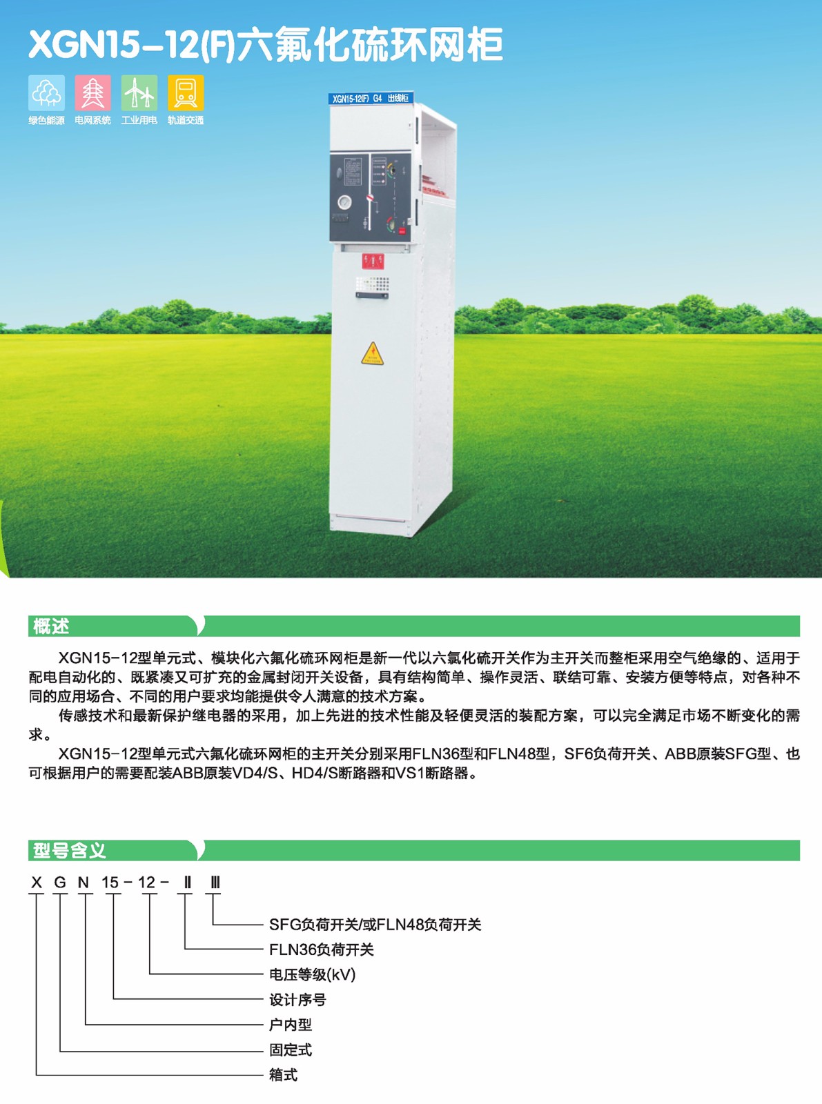 XGN15-12型單元式六奴化硫環(huán)網(wǎng)柜的主開關(guān)分別采用FLN36型和FLN48型,S F6負(fù)荷開關(guān)、ABB原裝SFG型、也可根據(jù)用戶的需要配裝ABB原裝VD4/S, HD4/S斷路器和VS斷路器。